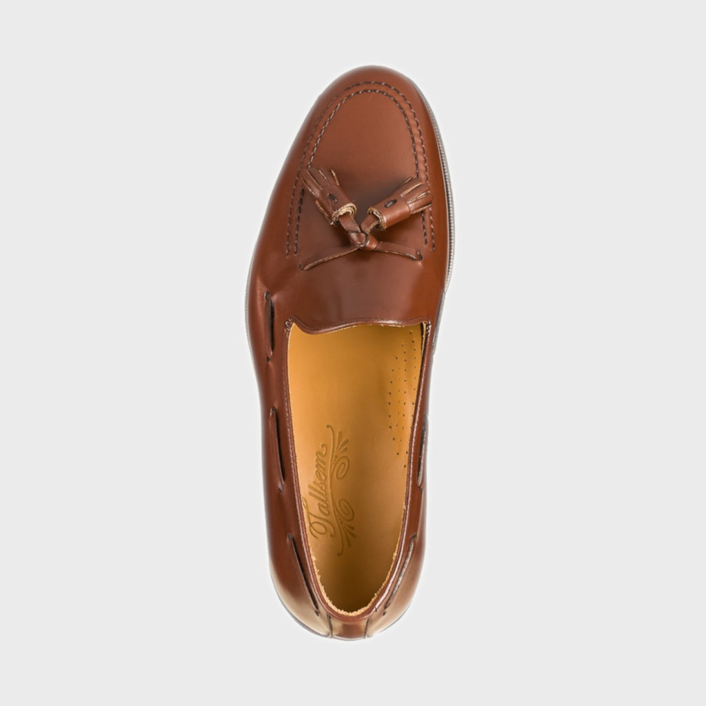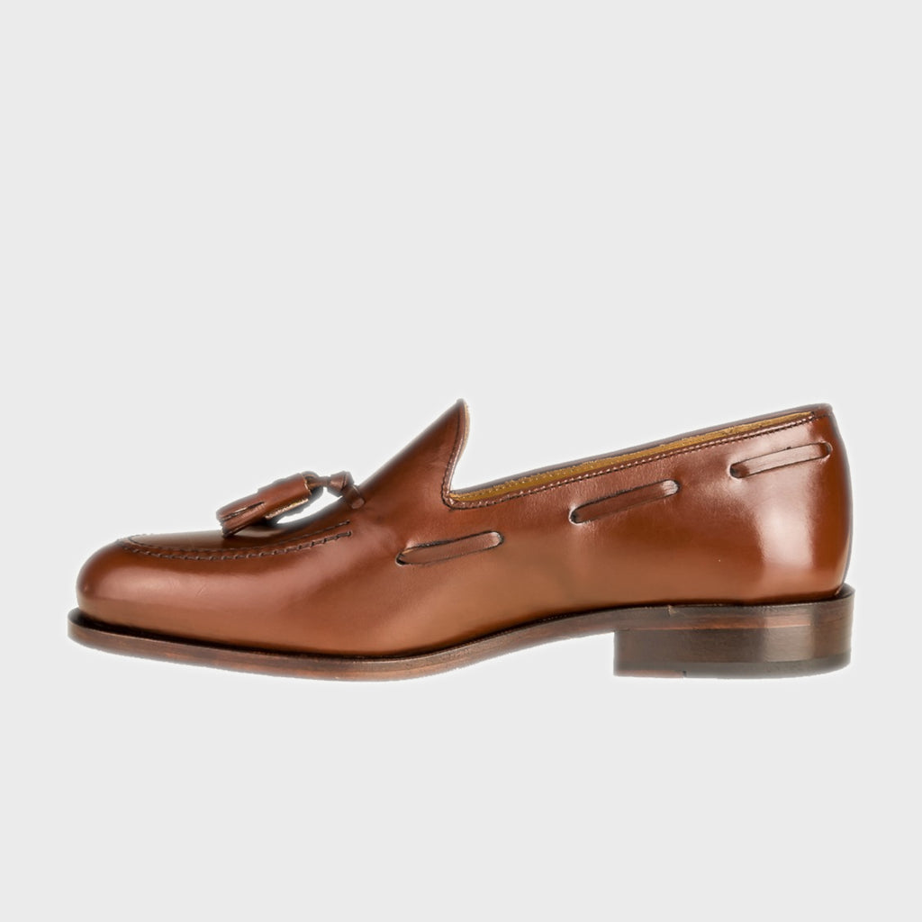 Zapato mocasin hombre borlas. Piel exterior en piel, calf brandy. El interior en piel vacuno. La suela cuero con consido Blake, que crea una armonía entre la durabilidad y flexibilidad. Horma Cox, punta sueve y fina. El ancho es medio y el calce estantar. Un zapato cómodo y para cualquier época del año.