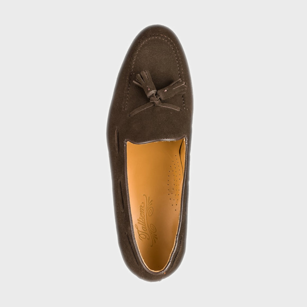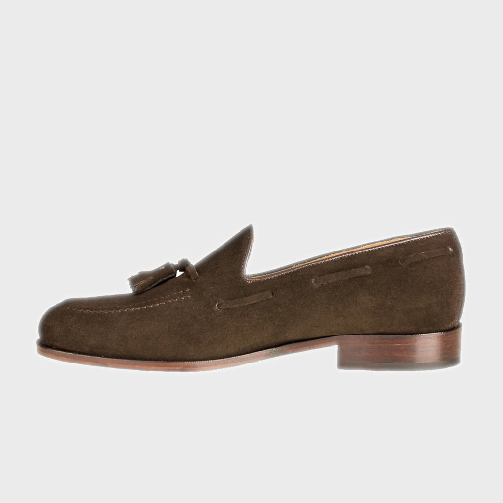 Zapato mocasin hombre borlas. Piel exterior en ante café. El interior en piel vacuno. La suela cuero con consido Blake, que crea una armonía entre la durabilidad y flexibilidad. Horma Cox, punta sueve y fina. El ancho es medio y el calce estantar. Un zapato cómodo y para cualquier época del año.