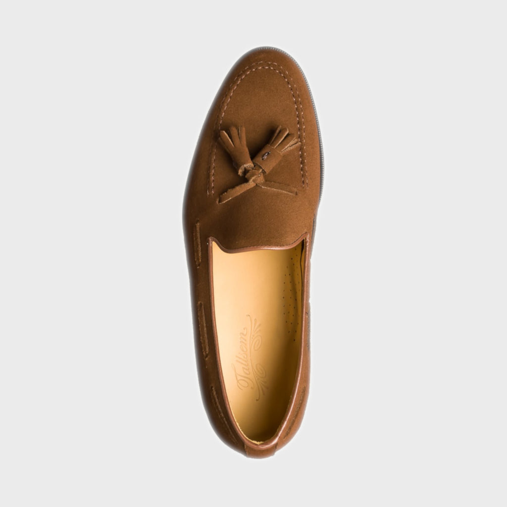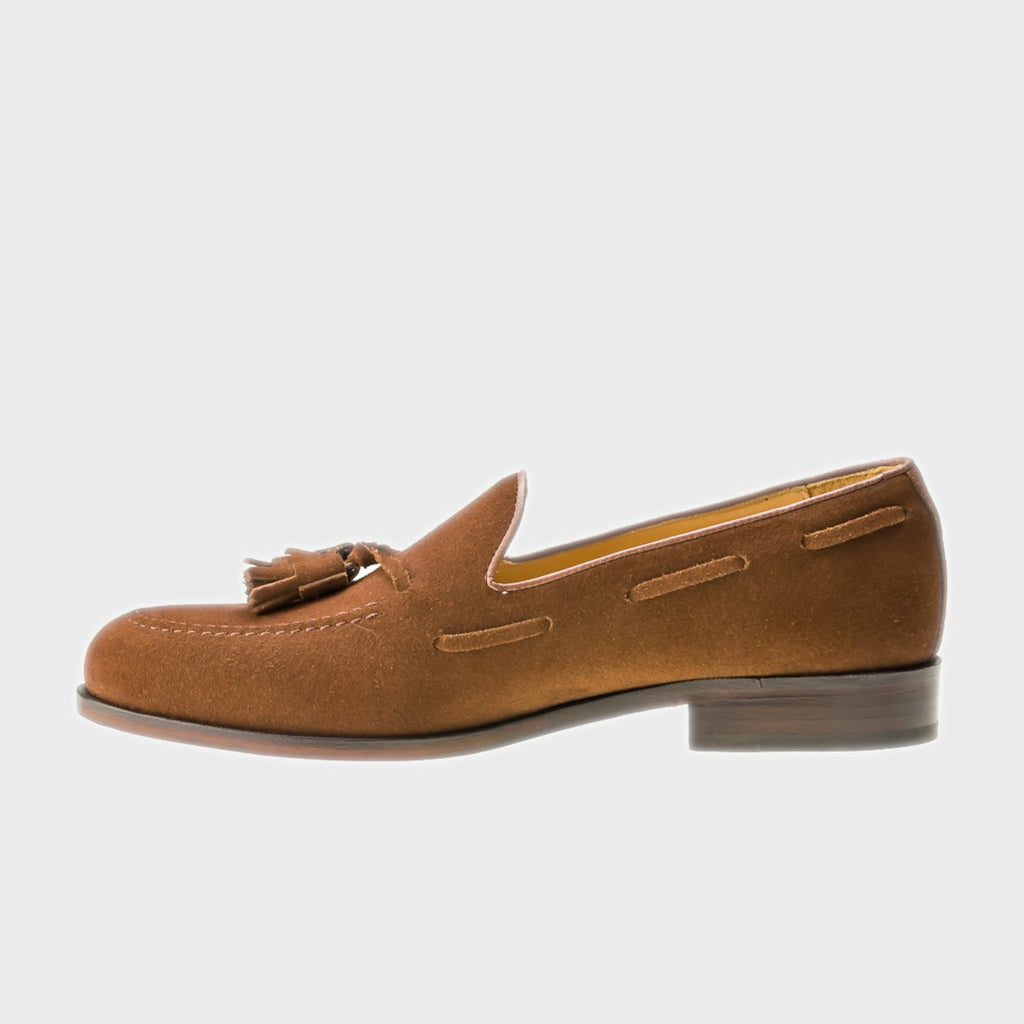 Zapato mocasin hombre borlas. Piel exterior en ante chocolate. El interior en piel vacuno. La suela cuero con consido Blake, que crea una armonía entre la durabilidad y flexibilidad. Horma Cox, punta sueve y fina. El ancho es medio y el calce estantar. Un zapato cómodo y para cualquier época del año.