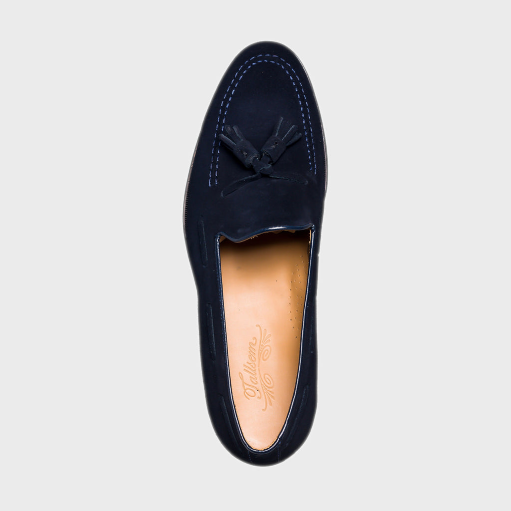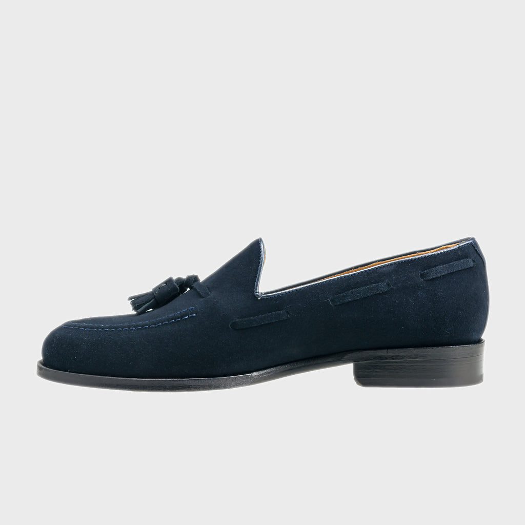Zapato mocasin hombre borlas. Piel exterior en ante marino. El interior en piel vacuno. La suela cuero con consido Blake, que crea una armonía entre la durabilidad y flexibilidad. Horma Cox, punta sueve y fina. El ancho es medio y el calce estantar. Un zapato cómodo y para cualquier época del año.