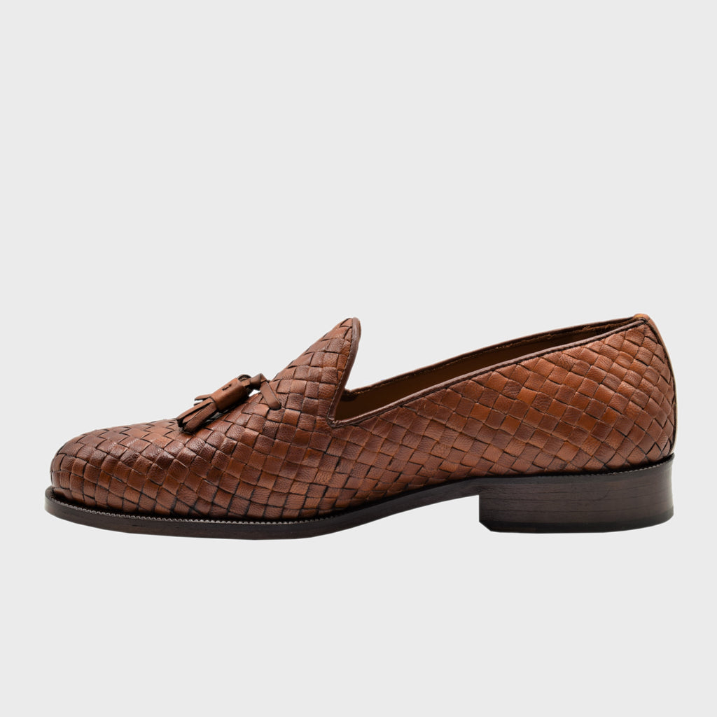 Zapato mocasín borlas. Piel esterior trenzada y pintada a mano. Lo cual el color puede diferenciarse a la foto. El interior en piel vacuno. La suela cuero con consido Blake, que crea una armonía entre la durabilidad y flexibilidad. Horma Cox, punta sueve y fina. El ancho es medio y el calce estantar. Un zapato cómodo y para cualquier época del año.