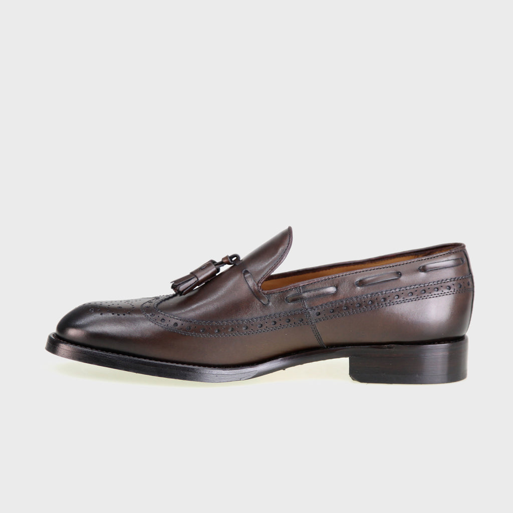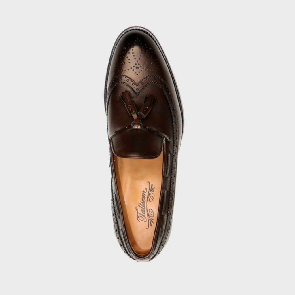 Zapato mocasín brogueado en borlas. Piel exterior calf francés marrón el cual es más flexible y crea pátina. El interior en piel vacuno. La suela cuero con cosido Blake, que crea una armonía entre la durabilidad y flexibilidad. Horma Beta, punta suave y fina. El ancho es medio y el calce estándar. Un zapato cómodo y para cualquier época del año.