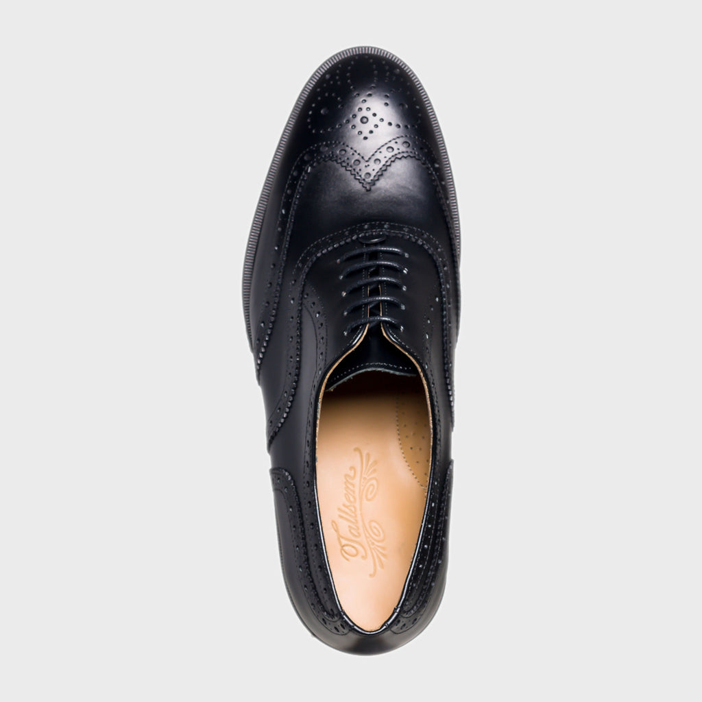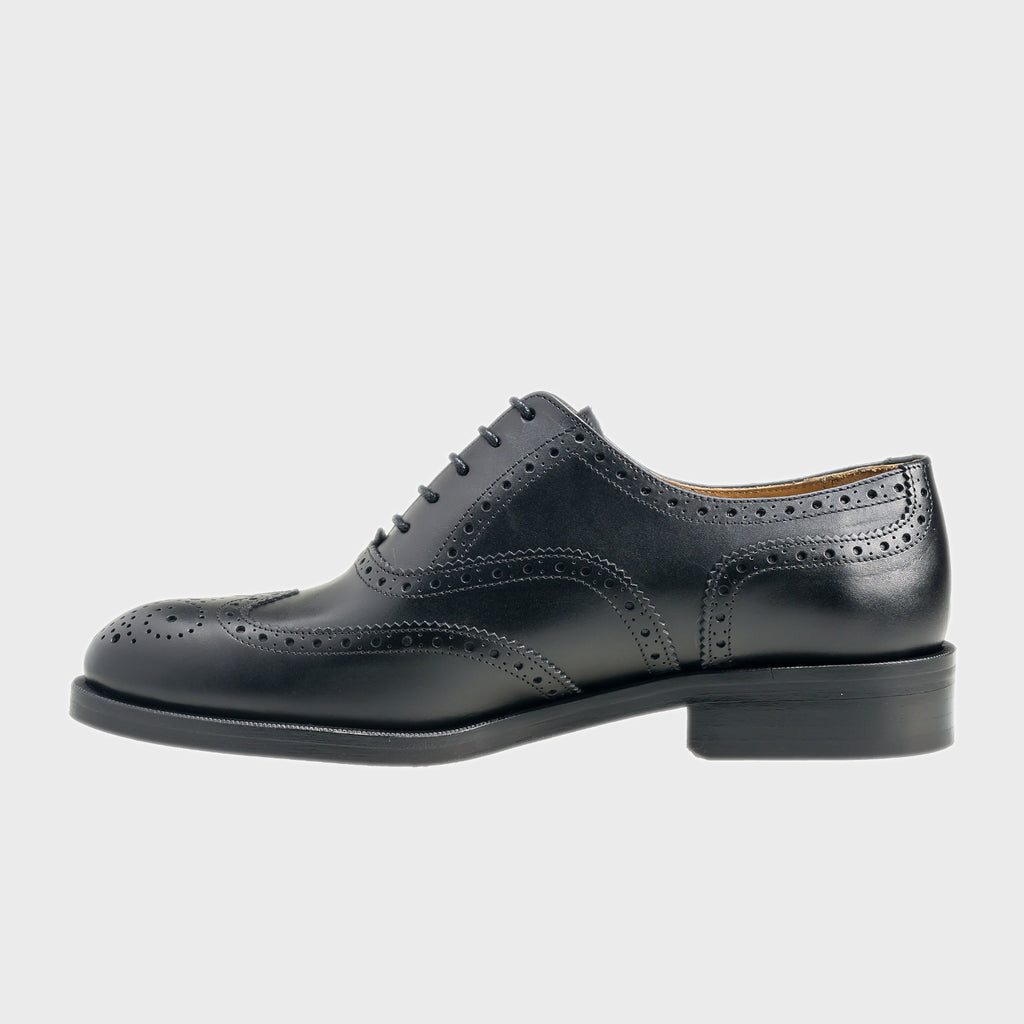 Classic men's dress shoe with openwork, festoon and laces. The exterior in leather, black calf and interior in cowhide. The mixed sole with Blake stitching, which creates a harmony between durability and flexibility. The Nelson last is an English F width last, being a rounded last it gives a few mm more in width and instep than standard, very adaptable to any type of foot. Rounded tip with vegan blade and soft lines. A formal shoe for all kinds of moments.